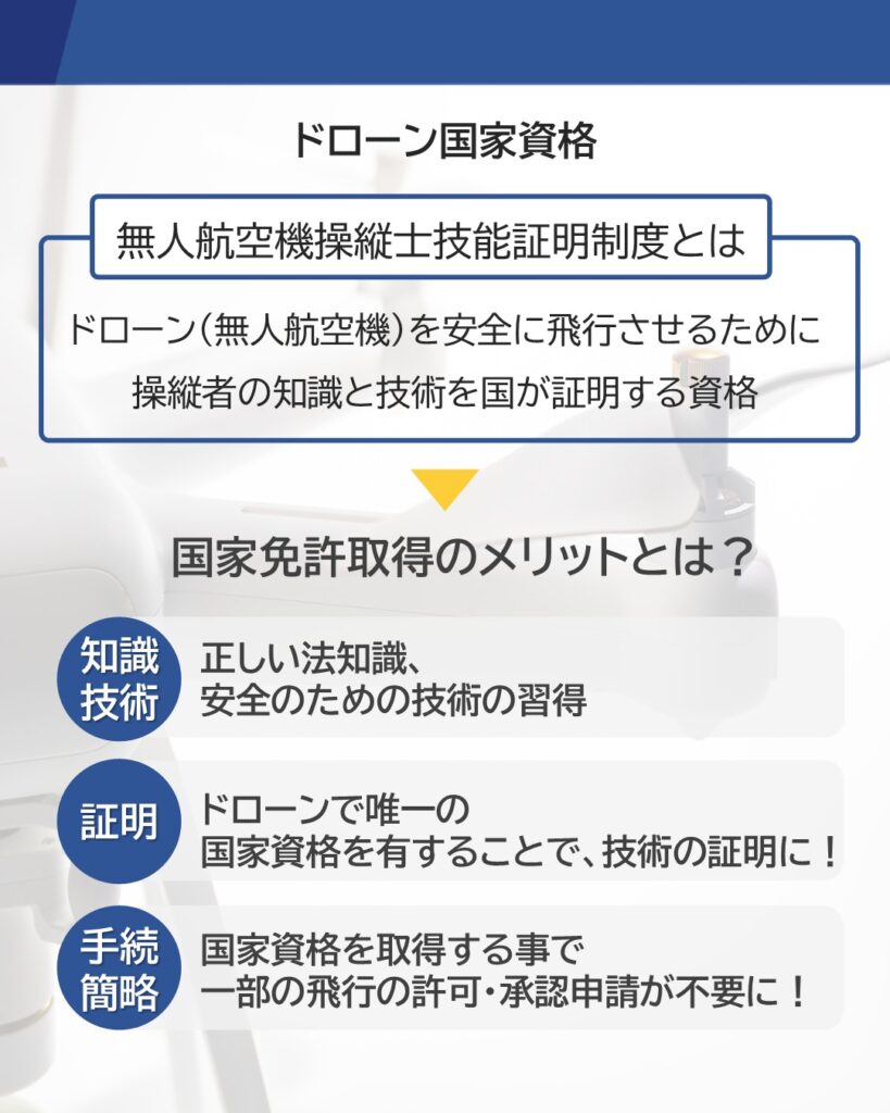 2022年に制度化された公的な免許です。「一等」と「二等」があり、取得することで飛行許可が不要になるケースがあるなど、大きなメリットがあります。