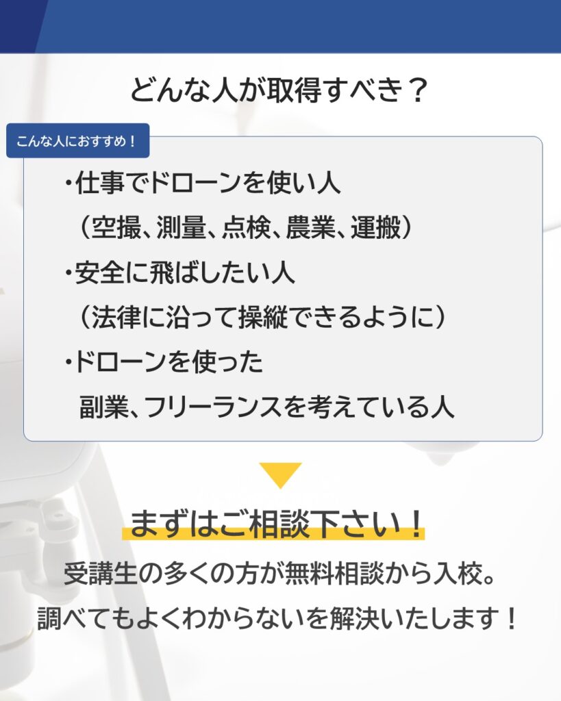- キャリアアップ: ドローンを武器に副業や独立を考えている方