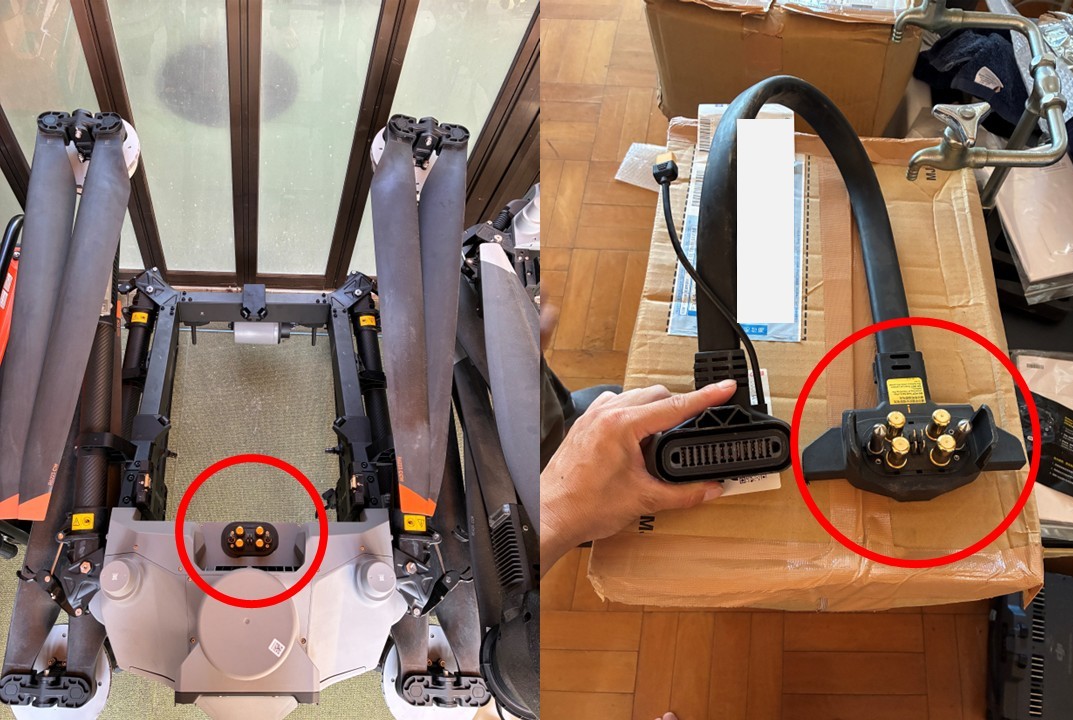 T70Pに使用するバッテリーは、DB2160というバッテリーでコネクター部分がこのようなタイプ(赤丸部分)です。そのため、これまで使用してきたC8000充電器やD6000iを使用して充電する場合は、写真右のような変換アダプターケーブルを使用する必要があります。